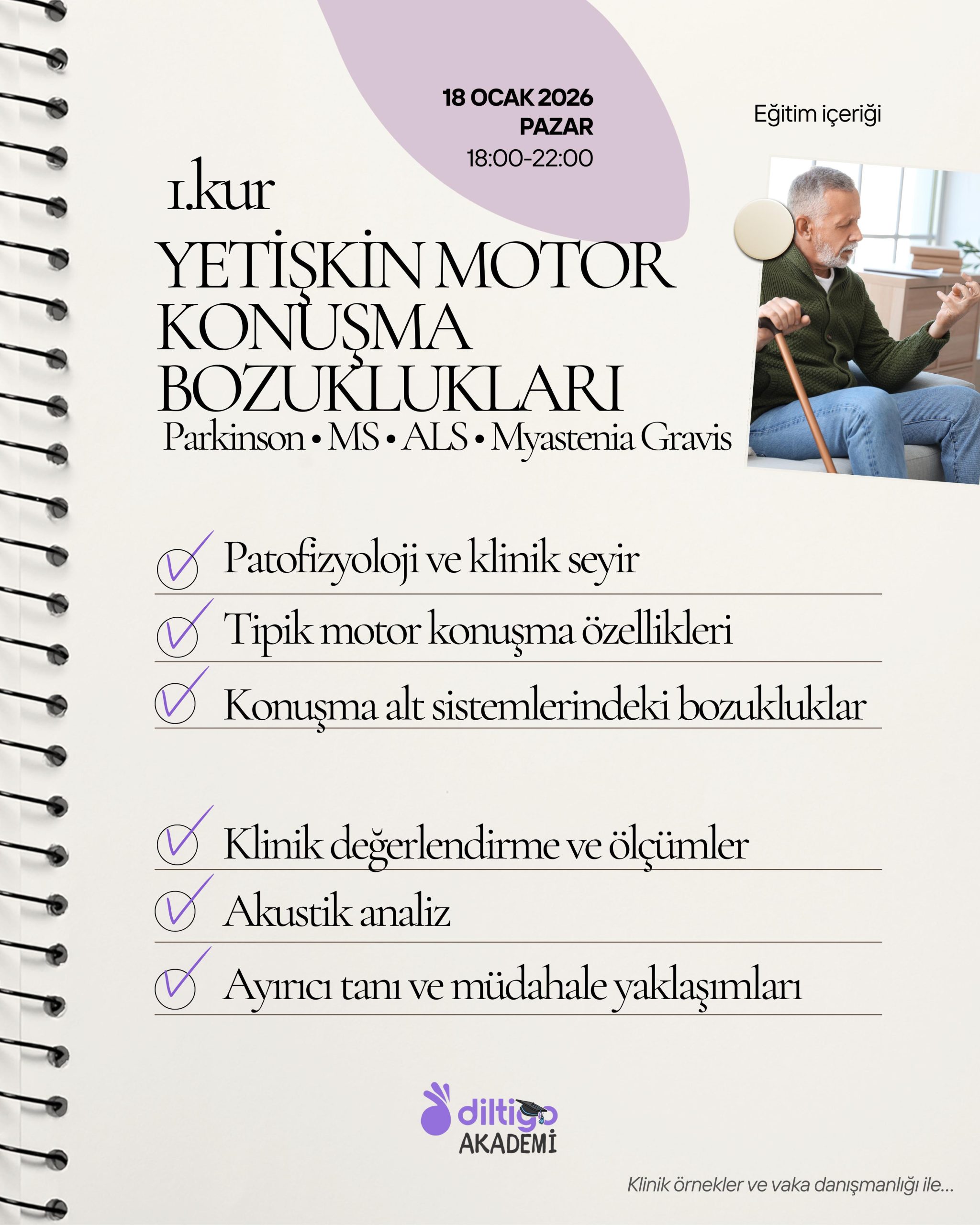 Bu eğitimde Parkinson hastalığı, multipl skleroz, amyotrofik lateral skleroz, myastenia gravis, serebral palsi ve Down sendromu gibi özel popülasyonlarda görülen motor konuşma bozuklukları; etiyoloji ve patofizyolojik mekanizmalar, hastalıkların başlangıç ve seyri, klinik özellikler ve eşlik eden bulgular, görülme sıklığı ve risk grupları, konuşma alt sistemlerinde ortaya çıkan bozulmalar ile tipik motor konuşma özellikleri bütüncül bir bakış açısıyla ele alınacaktır. Katılımcılar, farklı nörolojik ve gelişimsel tablolarda motor konuşmanın nasıl etkilendiğini klinik örnekler üzerinden ayrıntılı olarak öğrenme fırsatı bulacaktır.