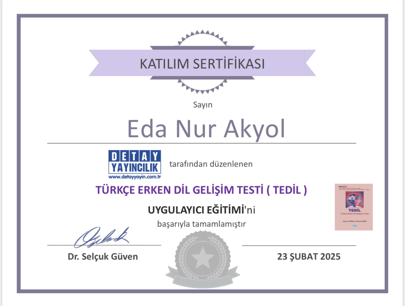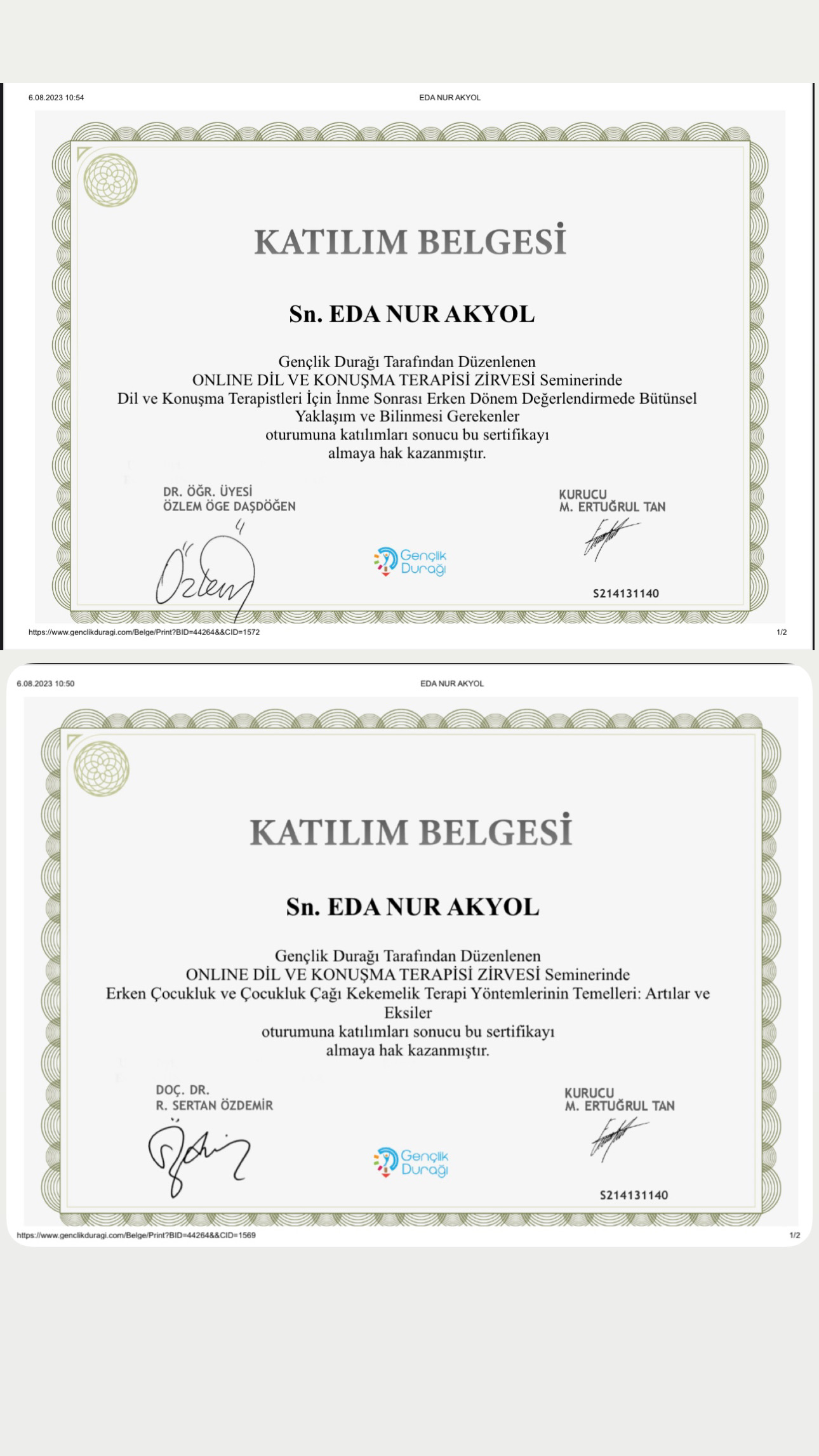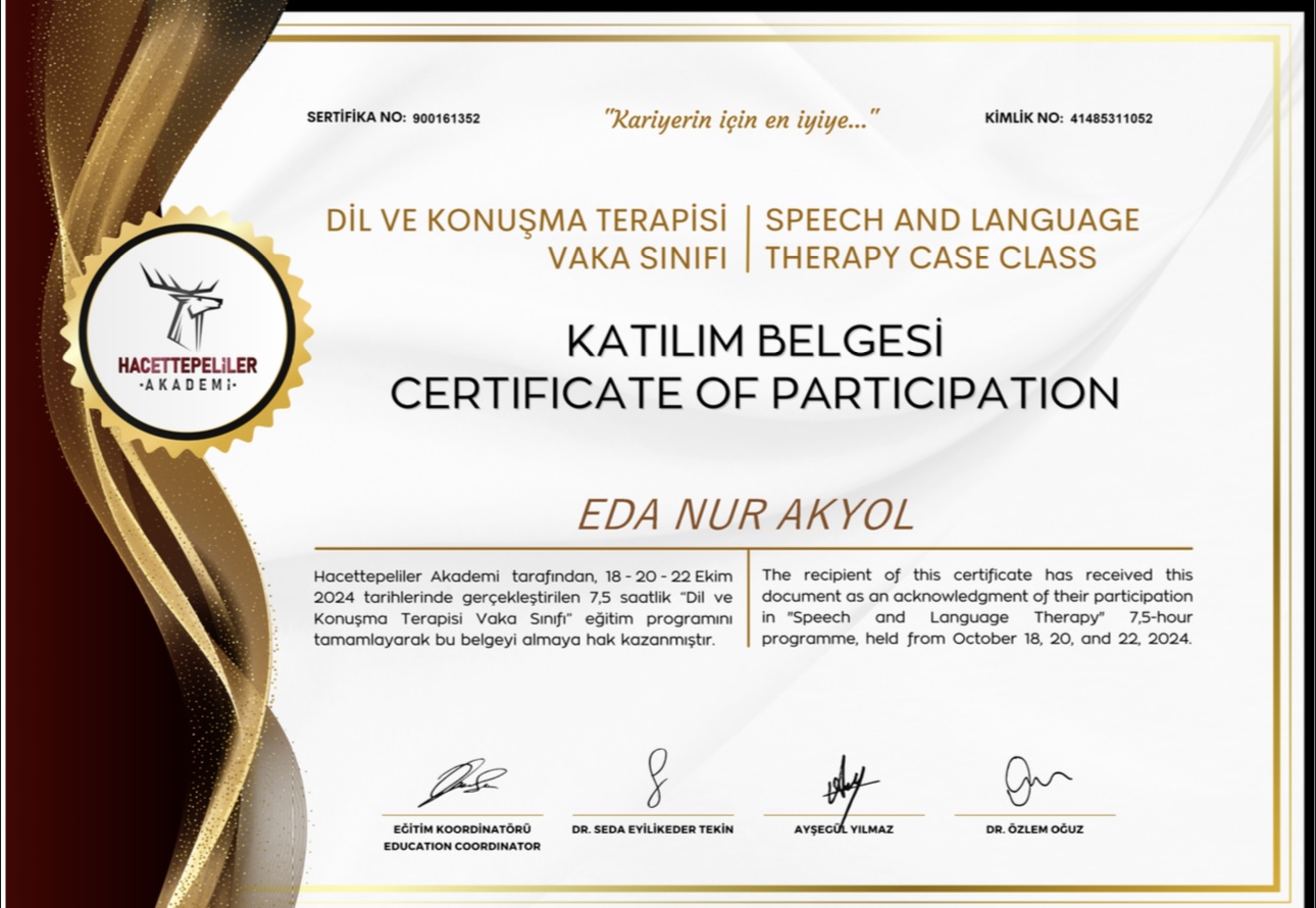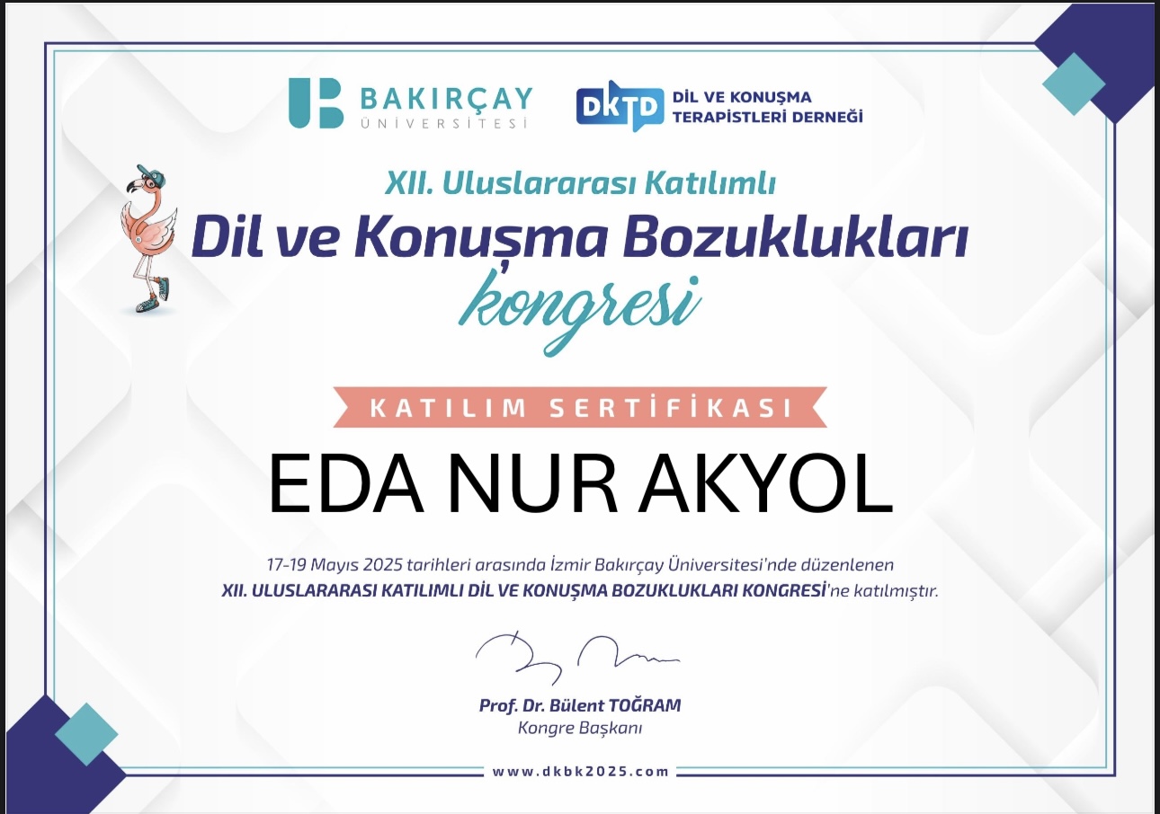 Merhaba, ben Dil ve Konuşma Terapisti Eda Nur Akyol. 2025 yılında Muğla Sıtkı Koçman Üniversitesi Dil ve Konuşma Terapisi bölümünden mezun oldum. Eğitimim süresince farklı yaş gruplarından bireylerle birçok alanda staj yaparak deneyim kazandım. Şu anda da her yaştan danışanla çalışarak dil ve konuşma terapisi alanında hizmet vermekteyim. Çalışma alanlarım arasında gecikmiş konuşma, artikülasyon ve fonolojik bozukluklar, akıcılık bozuklukları (kekemelik, hızlı/bozuk konuşma), ses bozuklukları, dil gelişiminde gerilik, nörojenik dil ve konuşma bozuklukları (afazi, dizartri, apraksi) ve yutma bozuklukları yer almaktadır.