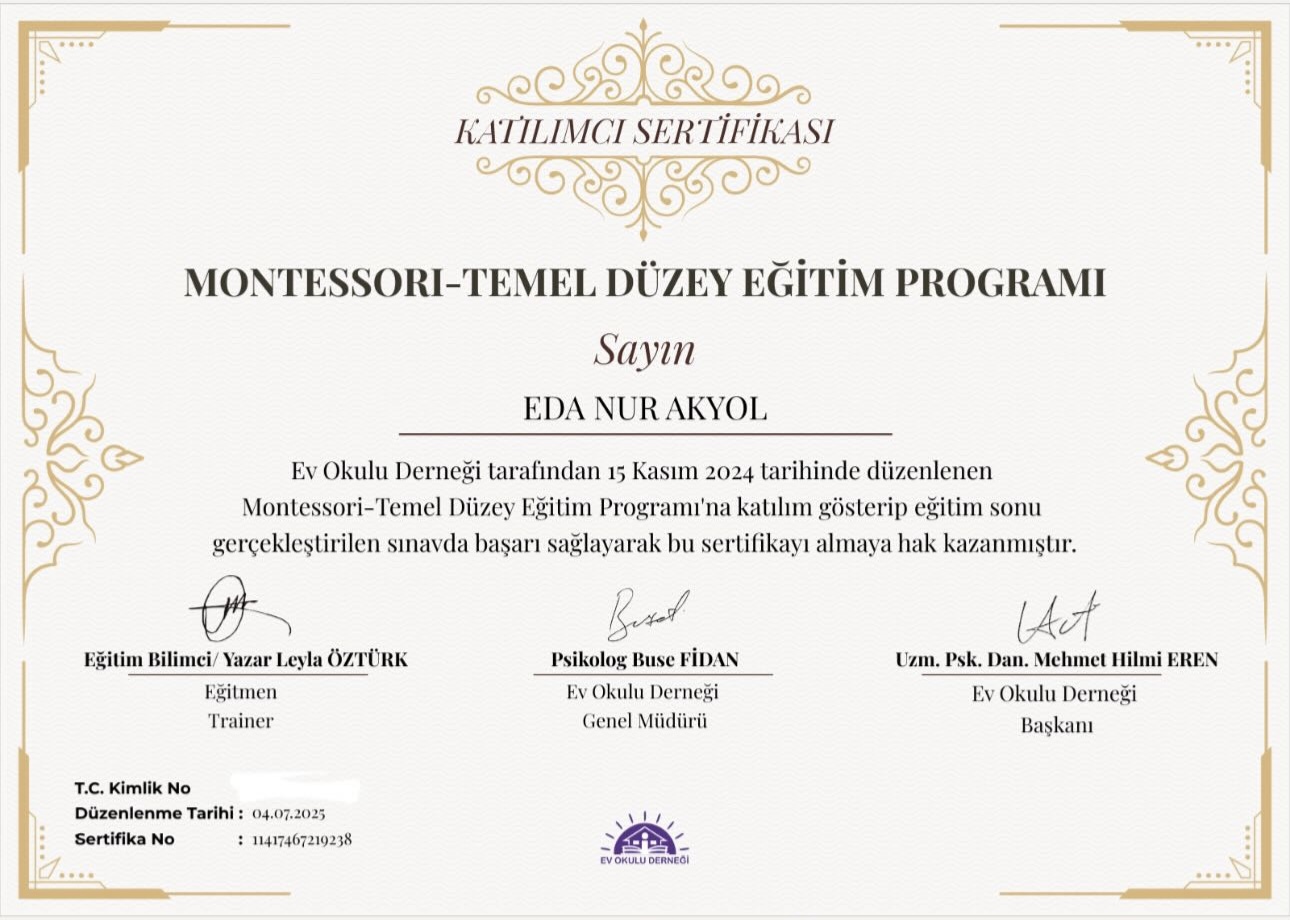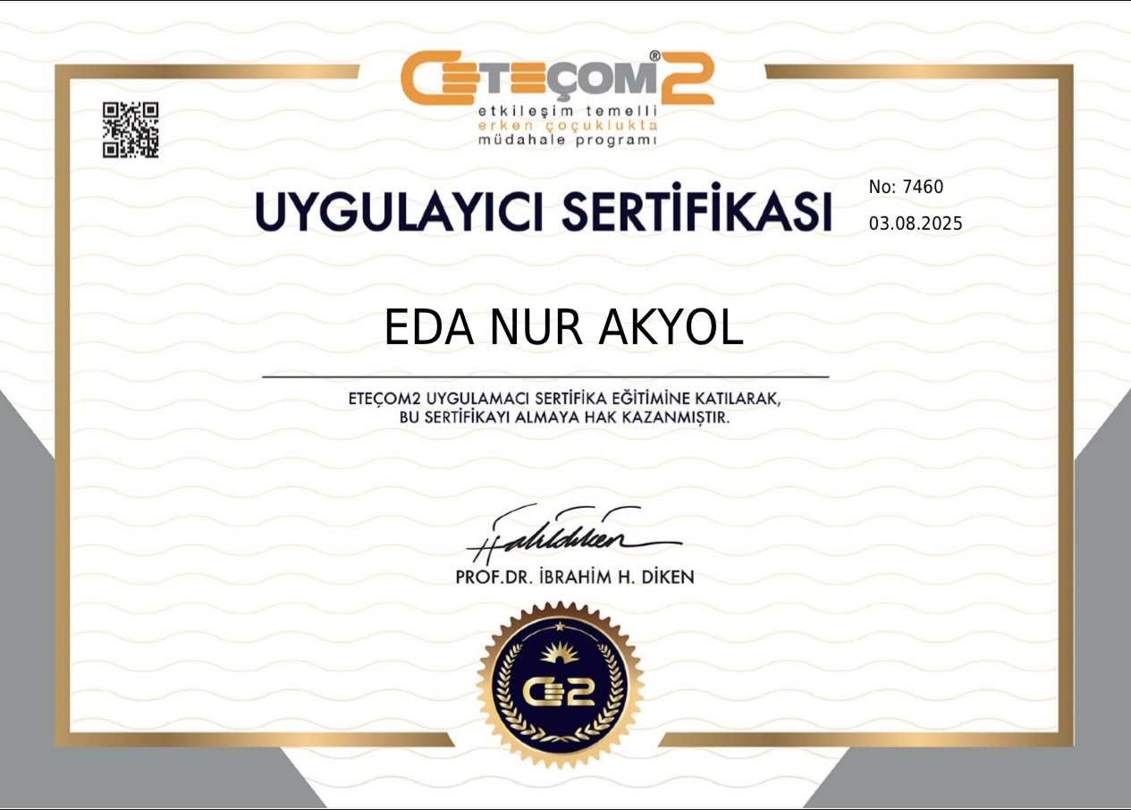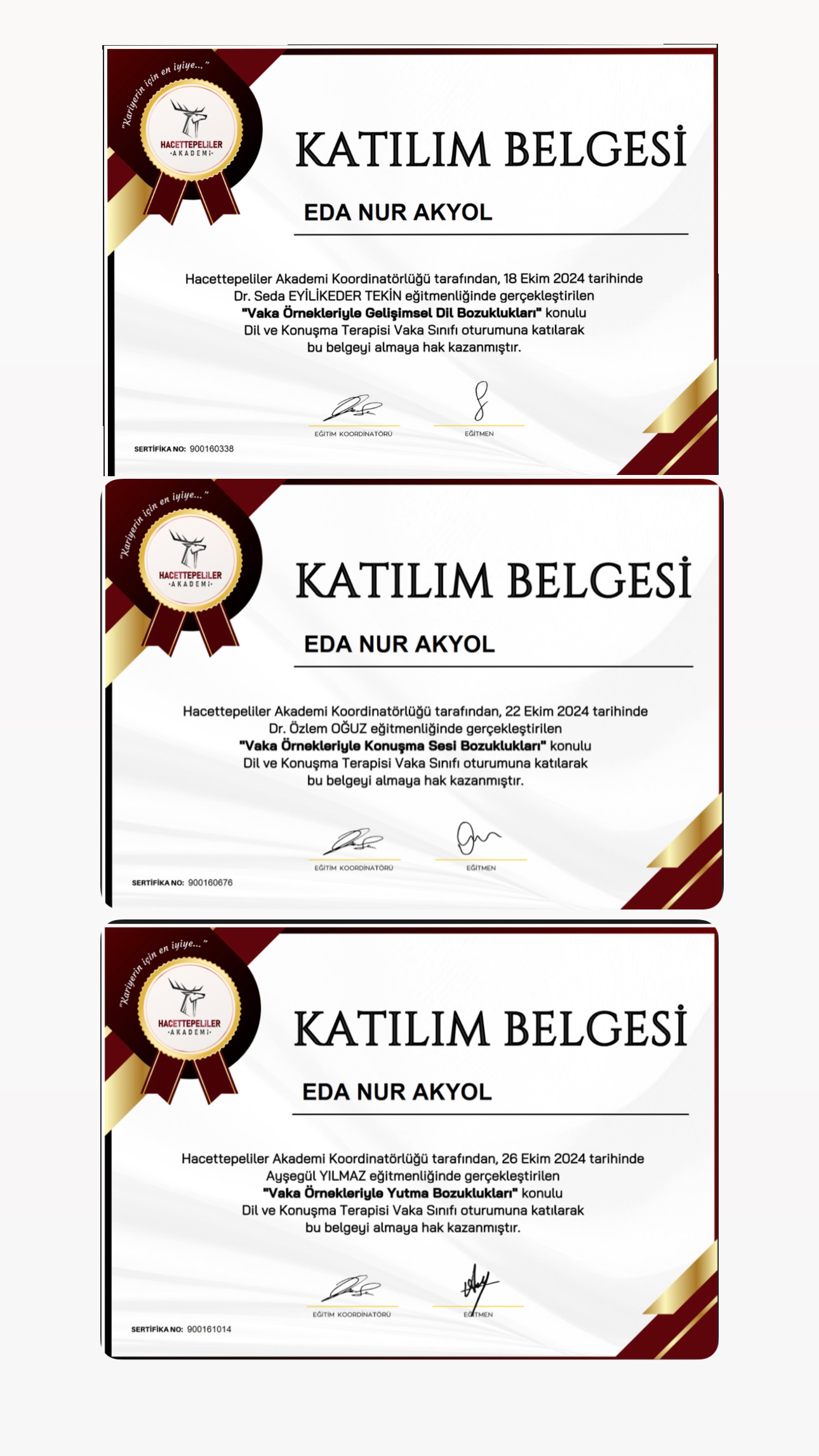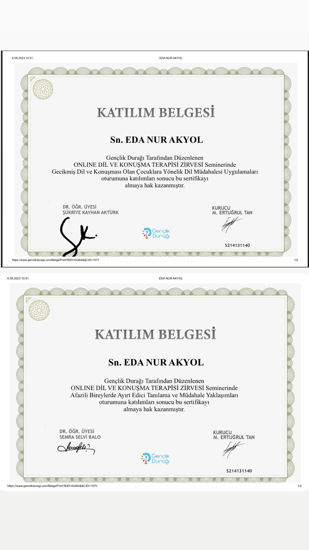 Merhaba, ben Dil ve Konuşma Terapisti Eda Nur Akyol. 2025 yılında Muğla Sıtkı Koçman Üniversitesi Dil ve Konuşma Terapisi bölümünden mezun oldum. Eğitimim süresince farklı yaş gruplarından bireylerle birçok alanda staj yaparak deneyim kazandım. Şu anda da her yaştan danışanla çalışarak dil ve konuşma terapisi alanında hizmet vermekteyim. Çalışma alanlarım arasında gecikmiş konuşma, artikülasyon ve fonolojik bozukluklar, akıcılık bozuklukları (kekemelik, hızlı/bozuk konuşma), ses bozuklukları, dil gelişiminde gerilik, nörojenik dil ve konuşma bozuklukları (afazi, dizartri, apraksi) ve yutma bozuklukları yer almaktadır.