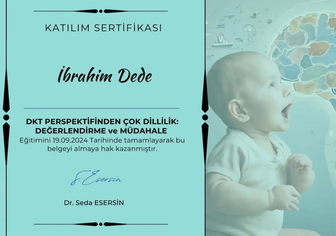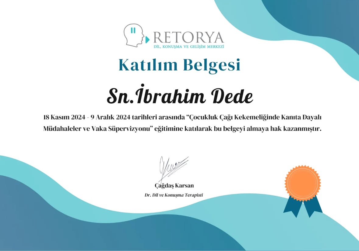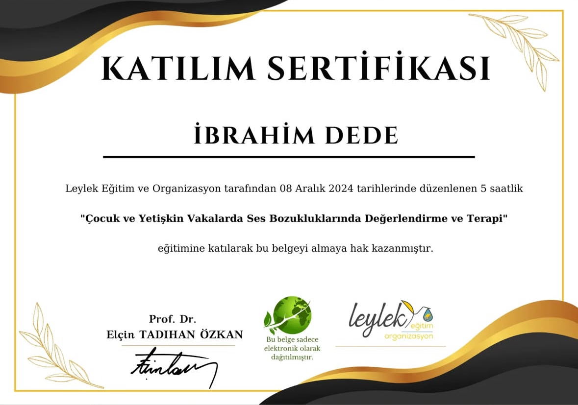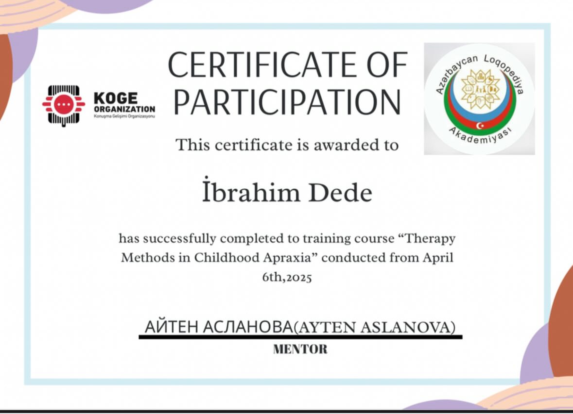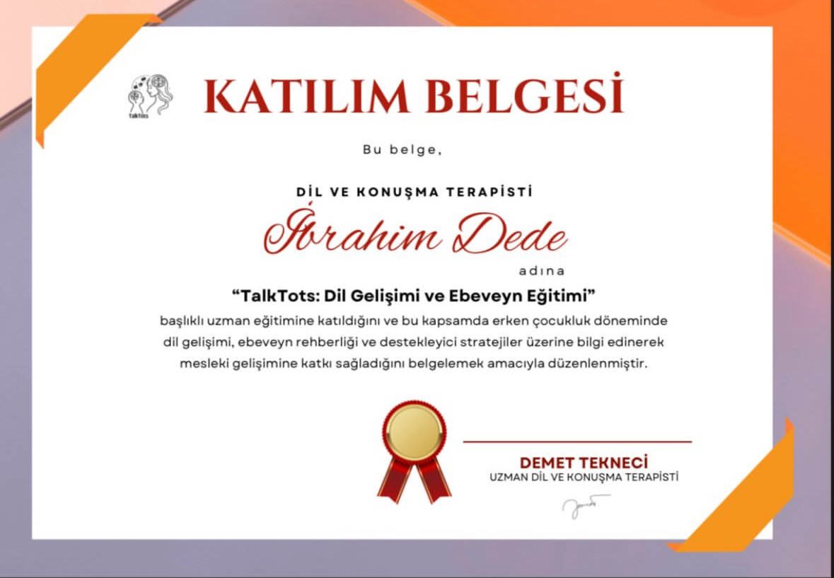 Ankara Yıldırım Beyazıt Üniversitesi Dil ve Konuşma Terapisi Bölümü mezunuyum. Her yaş grubunda dil ve konuşma bozuklukları ile çalışıyorum. Özellikle gecikmiş dil ve konuşma terapisi ve kekemelik terapisi alanlarında bilimsel yöntemlere dayalı, aile iş birliğini temel alan online ve yüz yüze dil ve konuşma terapisi hizmeti sunuyorum.