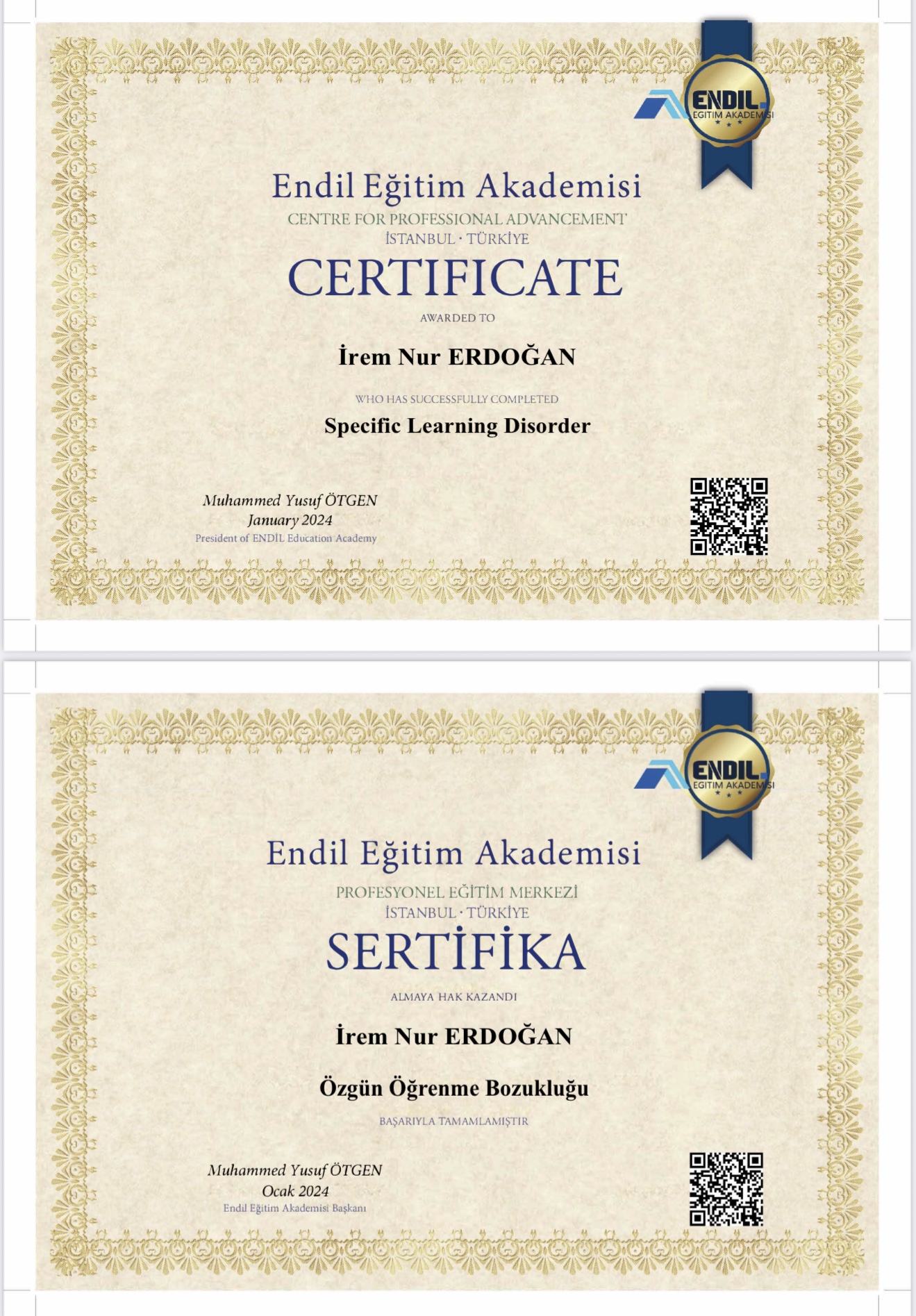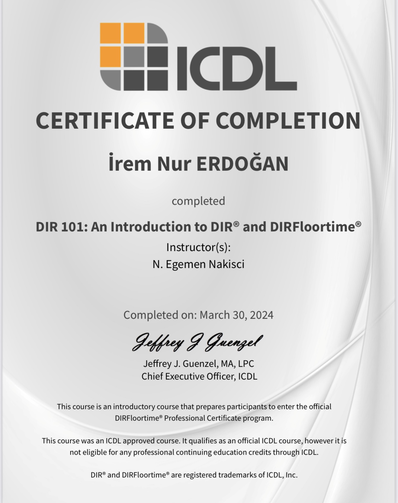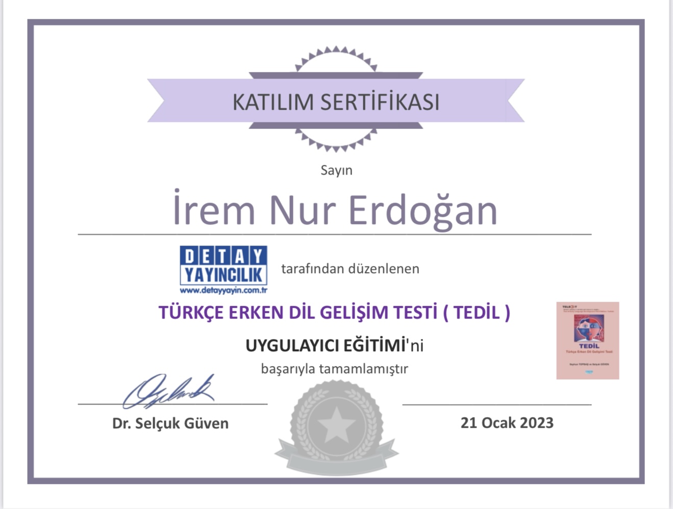 Ayrıca Floortime eğitimi ile gelişimsel yaklaşımlar konusunda donanım sahibiyim. Bunun yanında TEDİL ve gelişim testleri uygulama eğitimlerim bulunmaktadır, bu testleri danışanların dil ve gelişim düzeylerini değerlendirmek için kullanıyorum.