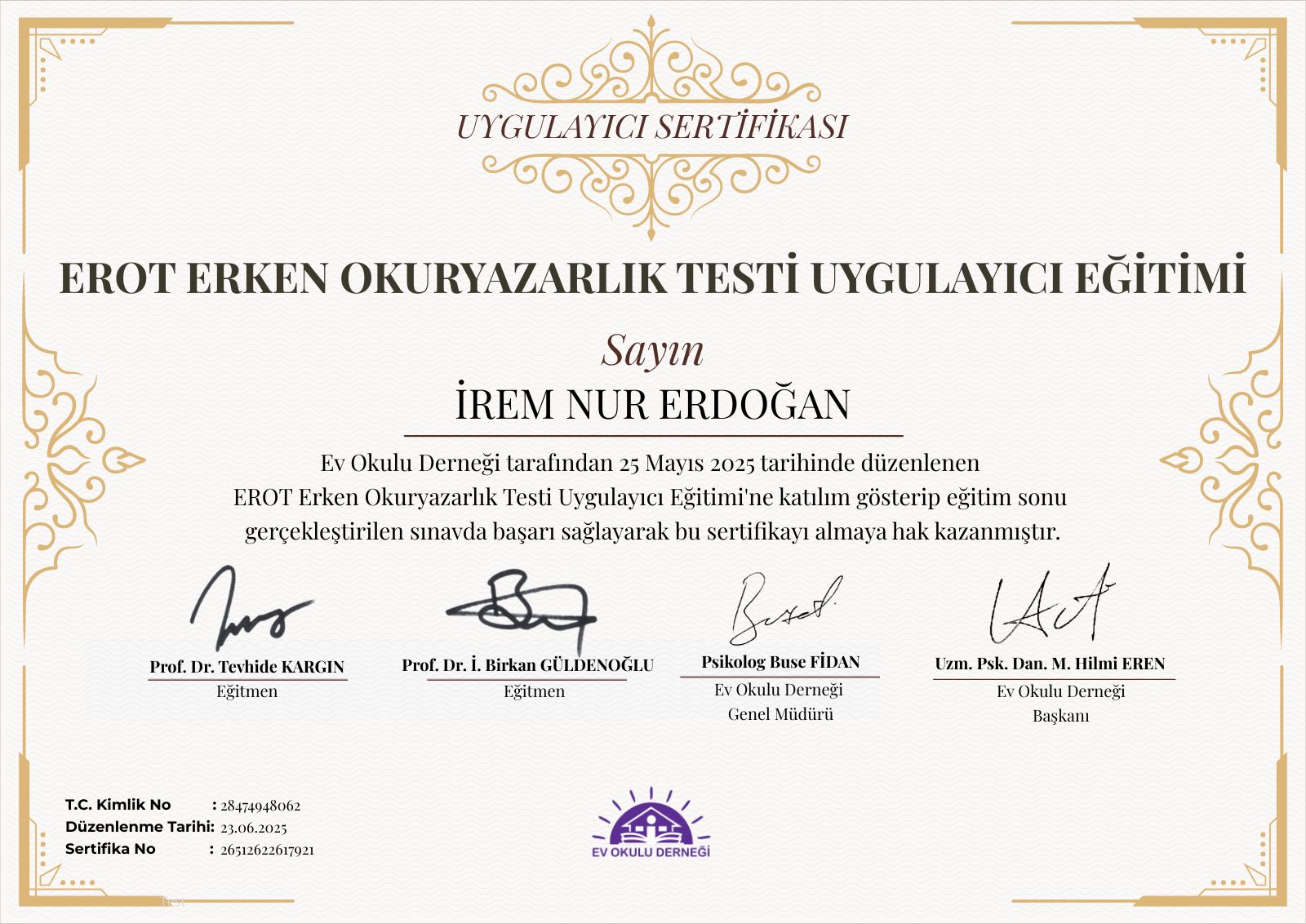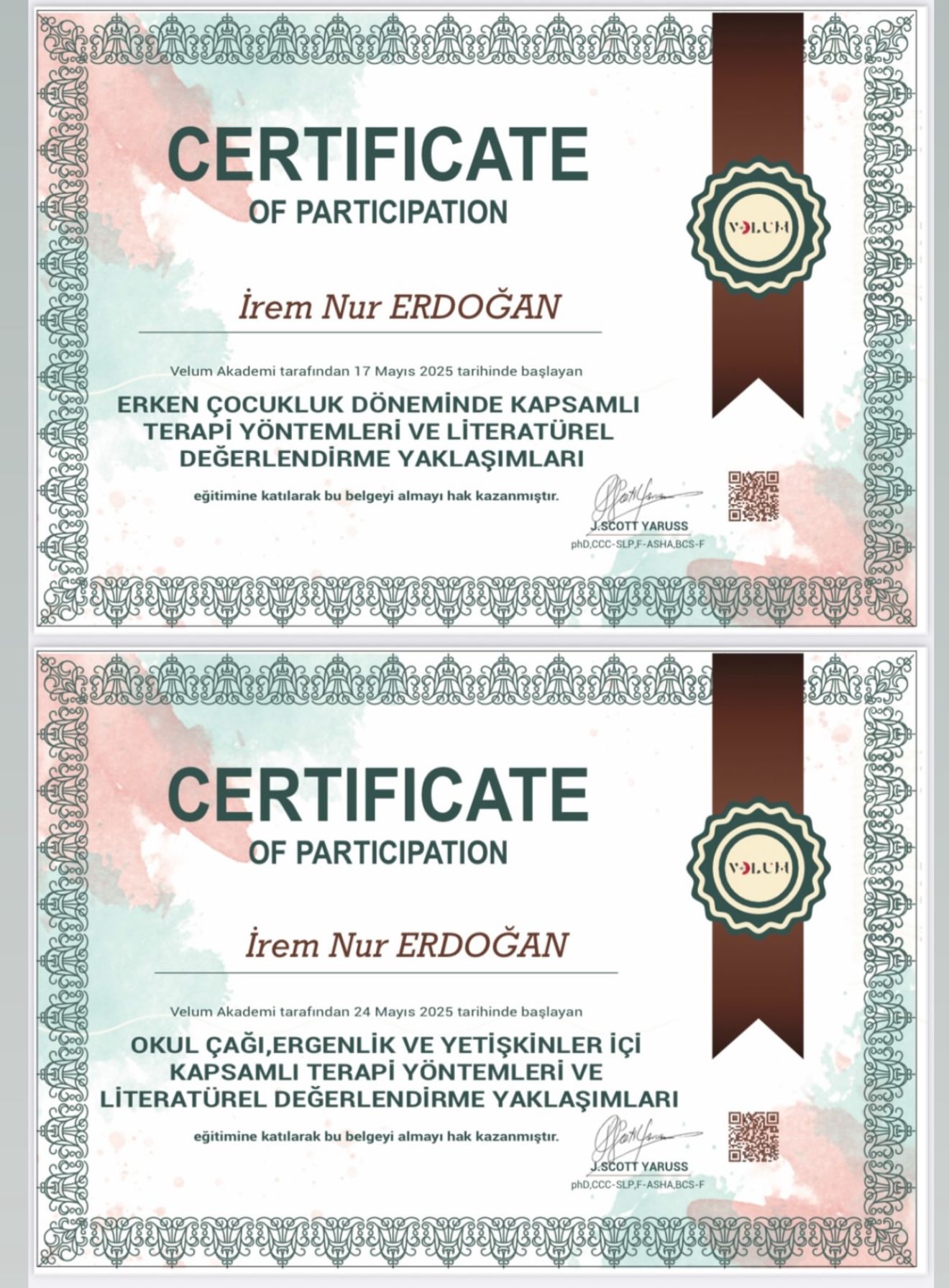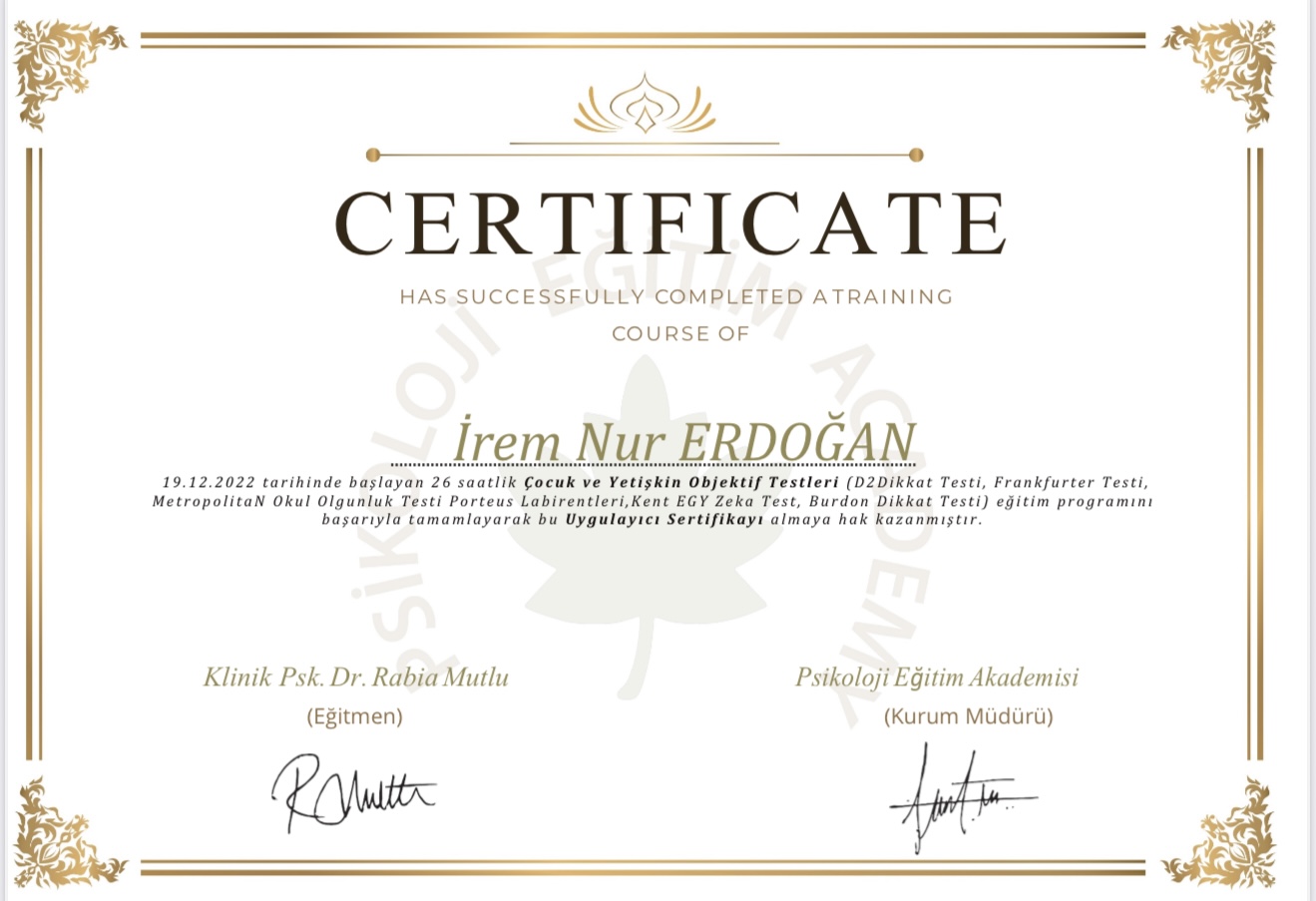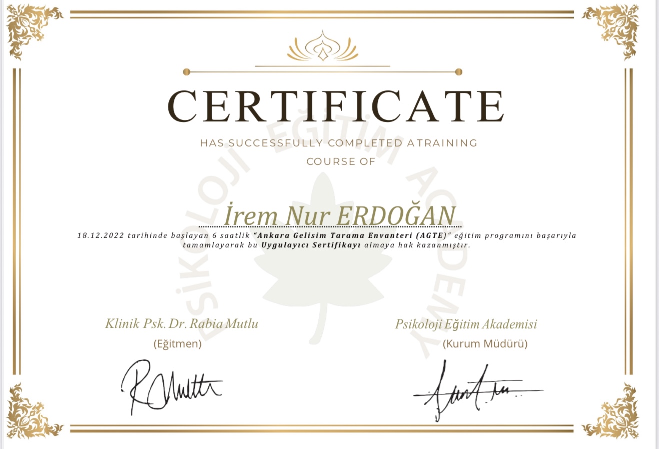 Ayrıca Floortime eğitimi ile gelişimsel yaklaşımlar konusunda donanım sahibiyim. Bunun yanında TEDİL ve gelişim testleri uygulama eğitimlerim bulunmaktadır, bu testleri danışanların dil ve gelişim düzeylerini değerlendirmek için kullanıyorum.