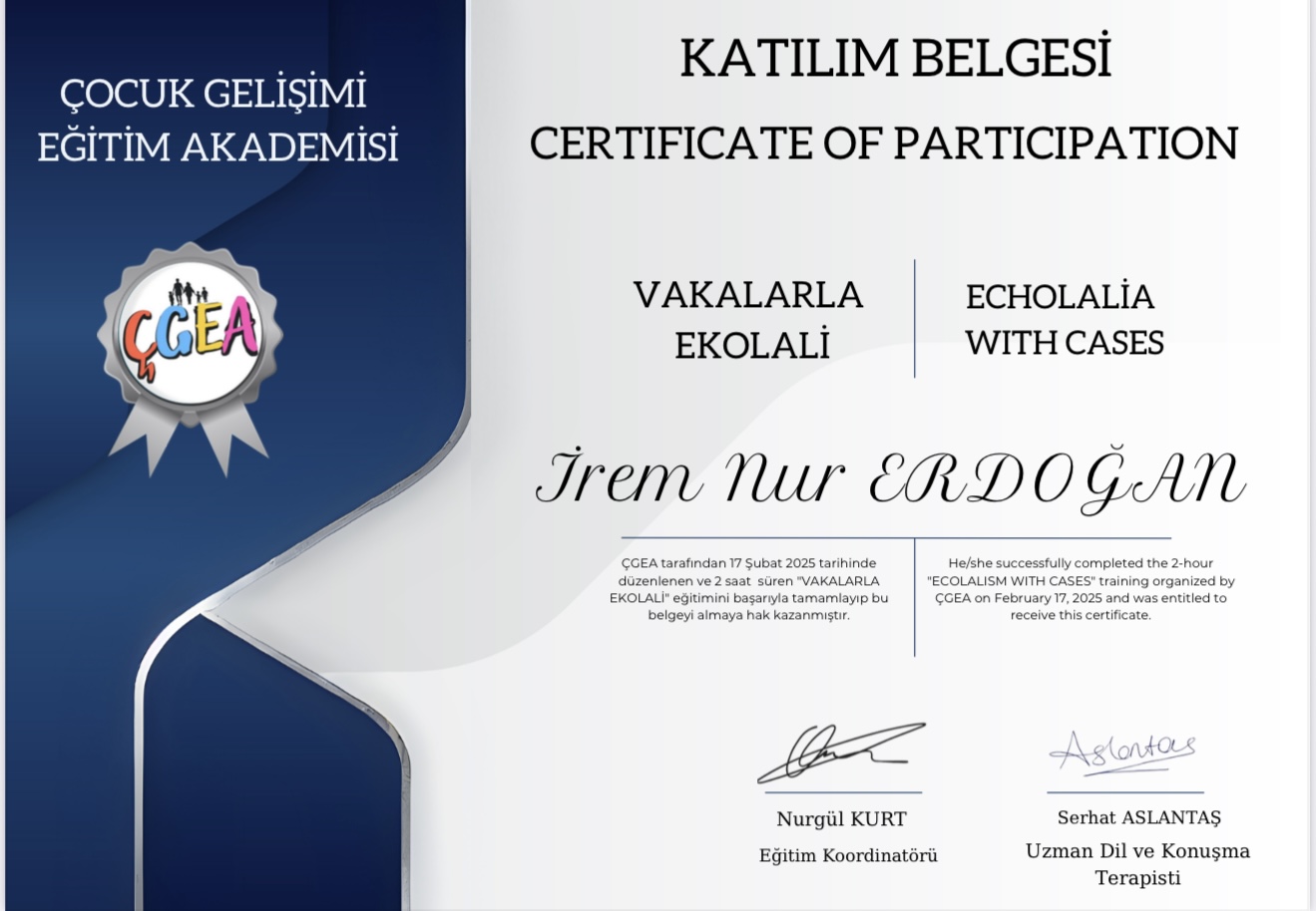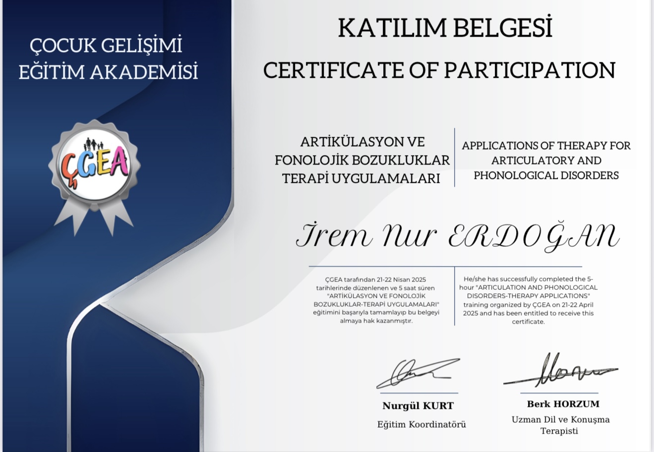Ben Sağlık Bilimleri Üniversitesi Dil ve Konuşma Terapisi Bölümü mezunuyum. Eğitim hayatım boyunca birçok hastanede ve rehabilitasyon merkezinde staj yaparak farklı yaş grupları ve vakalarla çalışma fırsatı buldum. Lisans eğitiminin ardından klinik ortamda aktif olarak çocuk, ergen ve yetişkinlerle çalışmaya devam etmekteyim.